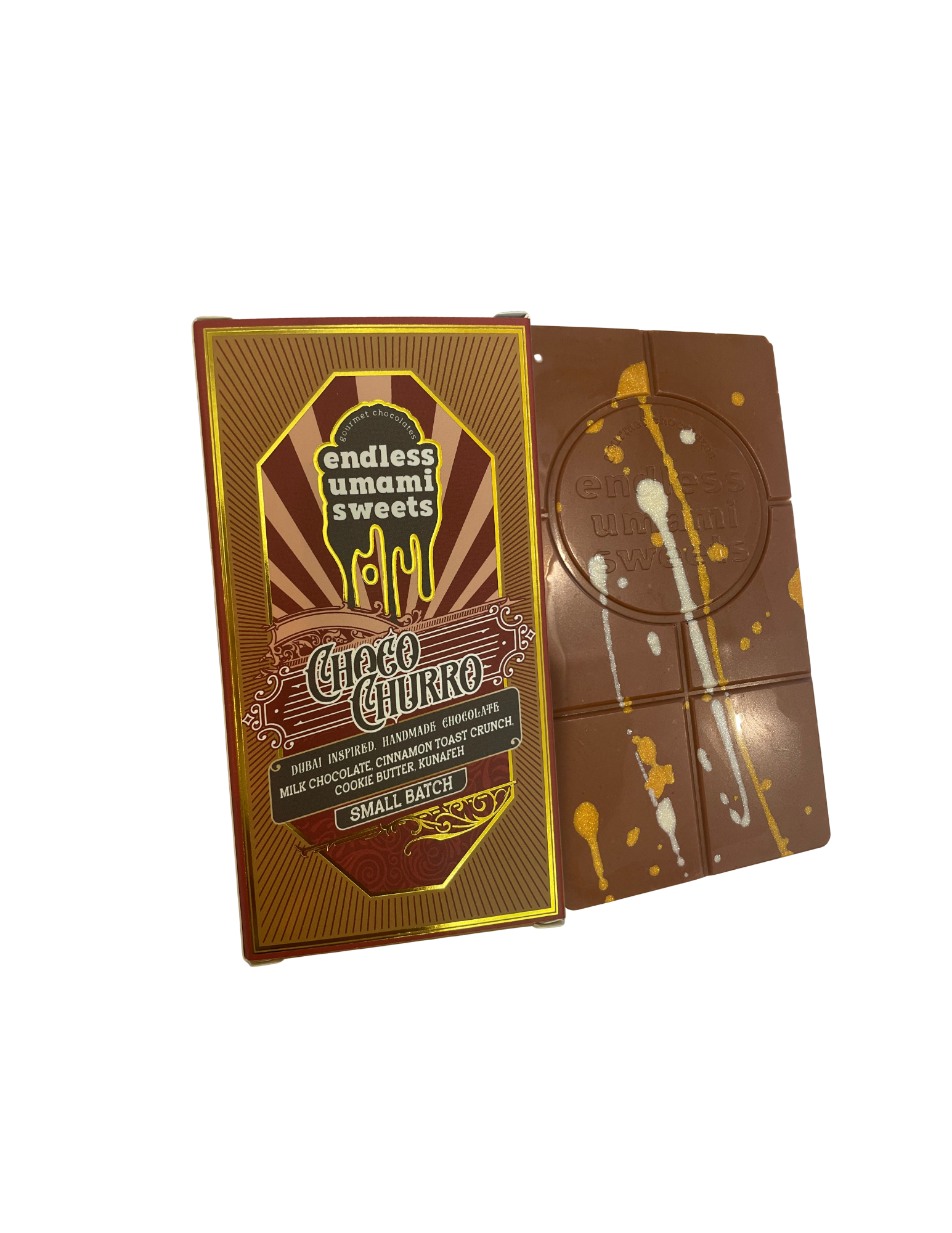 Creamy milk Belgian chocolate meets a nostalgic churro twist! Layered with Cinnamon Toast Crunch, rich cookie butter, and a crispy kunafeh finish. Sweet and perfectly crunchy—this one’s a flavor fiesta.