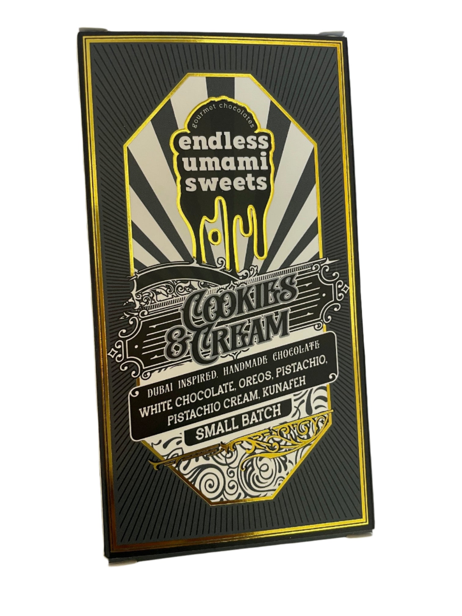 A childhood favorite, all grown up! Creamy white Belgian chocolate infused with oreo cookie crumble, swirled with rich pistachio cream, crunchy pistachio nuts, and a crispy kunafeh finish. It’s classic comfort with a gourmet twist!