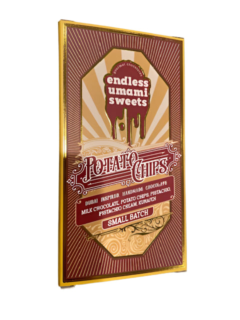 A crave-worthy fusion of textures and flavor. Creamy Belgian milk chocolate meets the salty crunch of potato chips, layered with rich pistachio cream, chopped pistachios, and a golden sprinkle of buttery kunafeh. Sweet, salty, nutty, and crispy—all in one unforgettable bite.