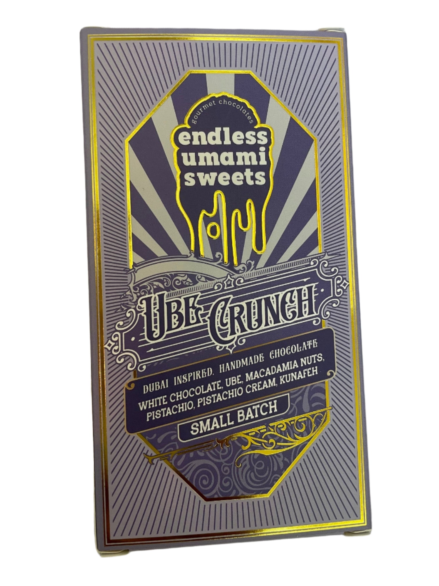 Say hello to your new favorite purple treat! This bar features creamy white Belgian chocolate infused with ube—a Filipino purple yam known for its rich vanilla-like aroma with a uniquely earthy and nutty twist. Layered with pistachio cream, crunchy macadamia and pistachio nuts, and finished with a golden kunafeh topping for that irresistible crunch.